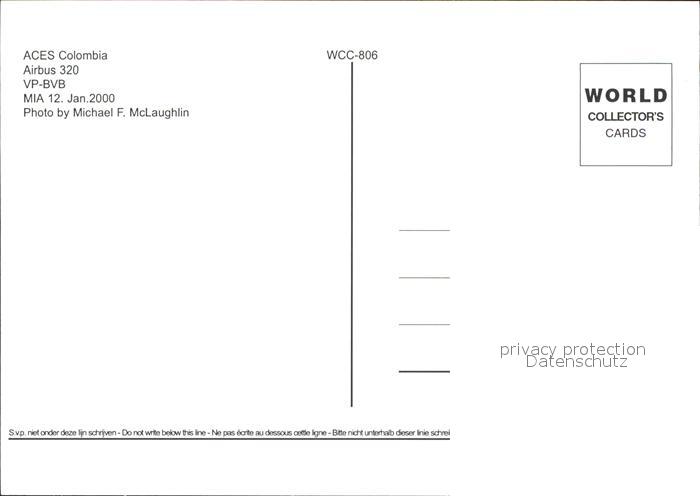 Flugzeuge Zivil ACES Colombia Airbus 320 VP-BVB postalisch nicht gelaufen Erhaltung siehe scans