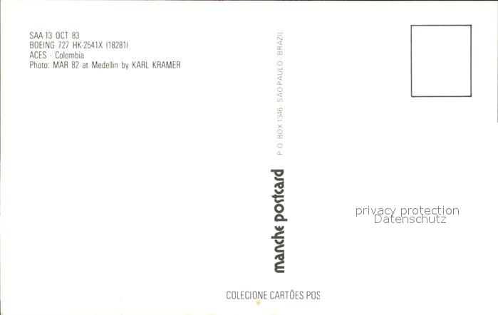 Flugzeuge Zivil ACES Colombia Boeing 727 HK-2541X 18281 postalisch nicht gelaufen Erhaltung siehe scans