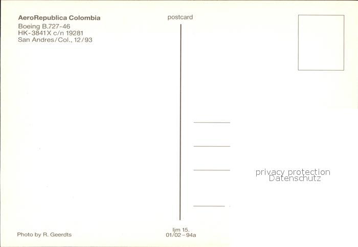Flugzeuge Zivil Aero Republica Colombia Boeing B.727-46 HK-3841X c/n 19281 postalisch nicht gelaufen Erhaltung siehe scans