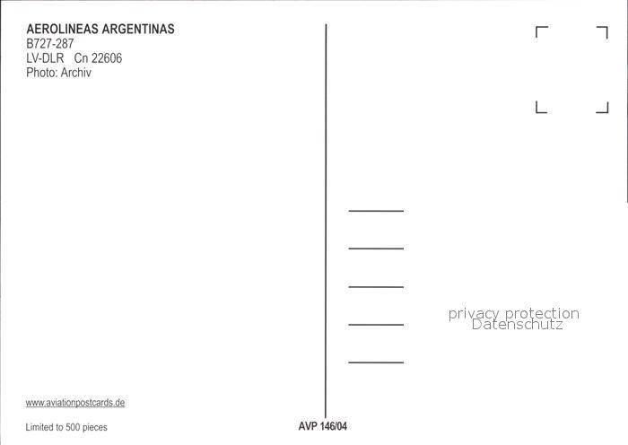 Flugzeuge Zivil Aerolineas Argentinas B727-287 LV-DLR Cn 22606 postalisch nicht gelaufen Erhaltung siehe scans