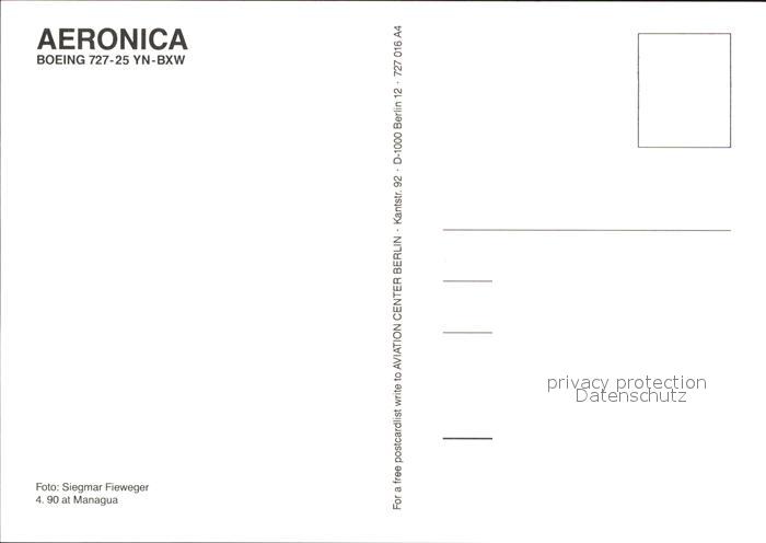 Flugzeuge Zivil Aeronica Boeing 727-25 YN-BXW postalisch nicht gelaufen Erhaltung siehe scans