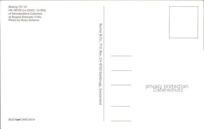 Flugzeuge Zivil Aerorepublica Colombia Boeing 727-41 HK-3780X cn 20422/fn 803 postalisch nicht gelaufen Erhaltung siehe scans
