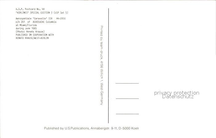 Flugzeuge Zivil Aerosucre Colombia Aerospatiale Caravelle IIR HK-2850 c/n 261 postalisch nicht gelaufen Erhaltung siehe scans