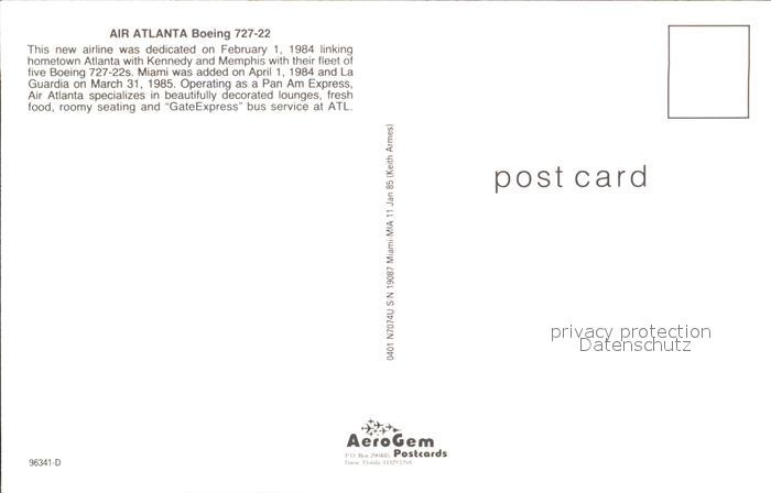 Flugzeuge Zivil Air Atlanta Boeing 727-22 N7074U S/N 19087 postalisch nicht gelaufen Erhaltung siehe scans