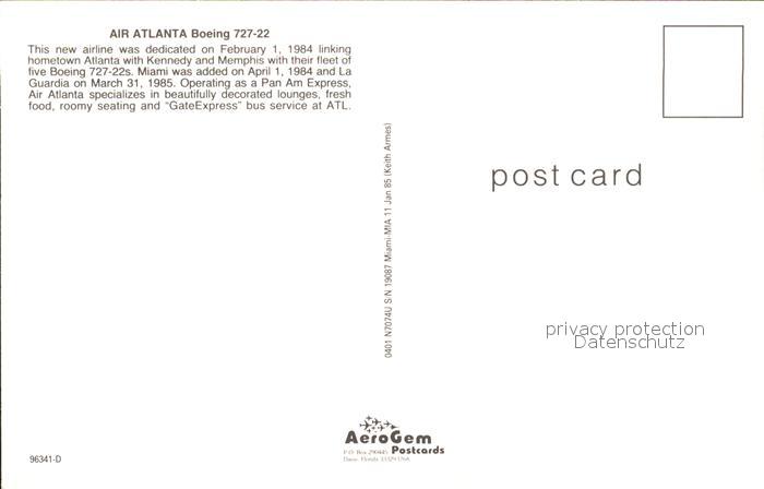 Flugzeuge Zivil Air Atlanta Boeing 727-22 N7074U postalisch nicht gelaufen Erhaltung siehe scans