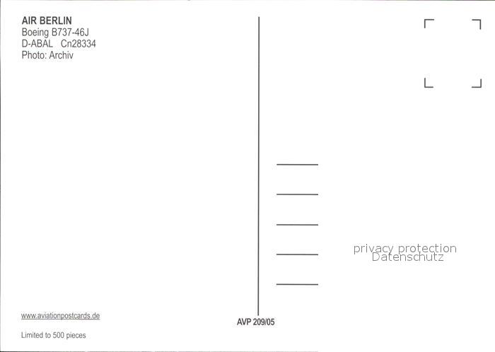 Flugzeuge Zivil Air Berlin B737-46J D-ABAL cn 28334 postalisch nicht gelaufen Erhaltung siehe scans