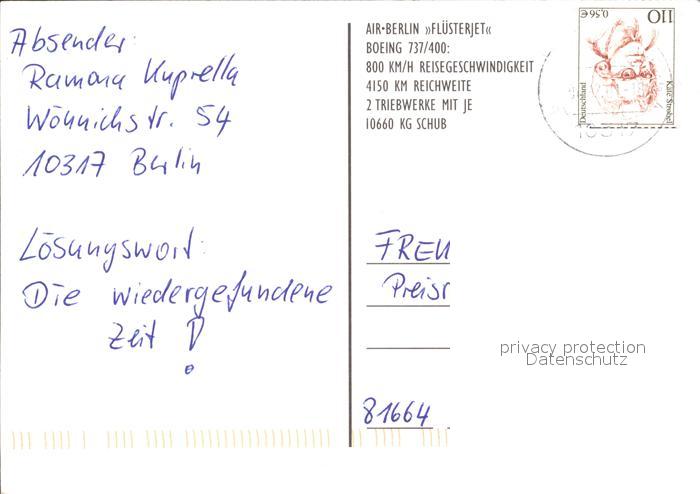 alte Postkarte Flugzeuge Zivil Air-Berlin Fluesterjet Boeing 737/400 postalisch gelaufen Erhaltung siehe scans