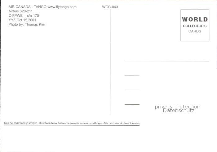 Flugzeuge Zivil Air Canada Tango Airbus 320-211 C-FPWE c/n 175 postalisch nicht gelaufen Erhaltung siehe scans