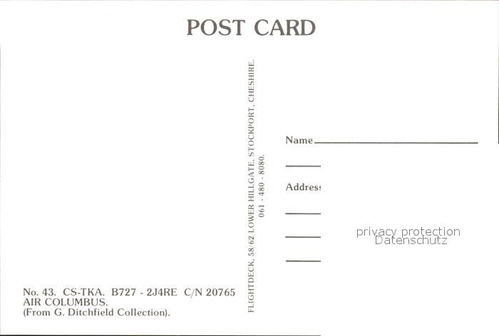 Flugzeuge Zivil Air Columbus B727- 2J4RE CS-TKA c/n 20765 postalisch nicht gelaufen Erhaltung siehe scans