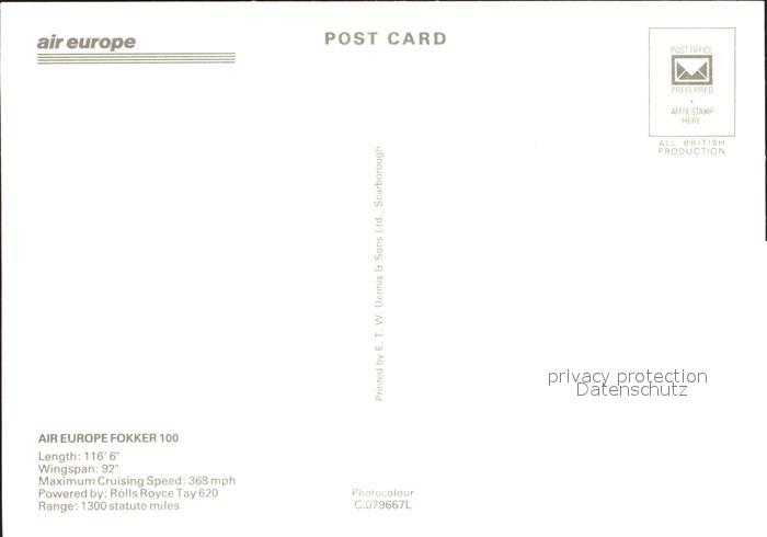 Flugzeuge Zivil Air Europe Fokker 100 postalisch nicht gelaufen Erhaltung siehe scans