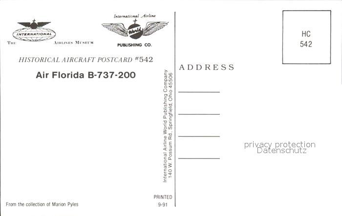 Flugzeuge Zivil Air Florida B-737-200 postalisch nicht gelaufen Erhaltung siehe scans
