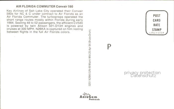 Flugzeuge Zivil Air Florida Commuter Convair 580 N26KA postalisch nicht gelaufen Erhaltung siehe scans