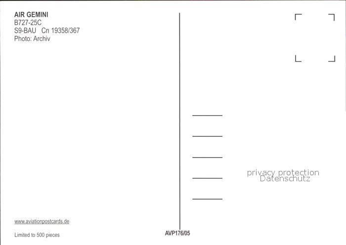 Flugzeuge Zivil Air Gemini B727-25C S9-BAU cn 19358/367 postalisch nicht gelaufen Erhaltung siehe scans
