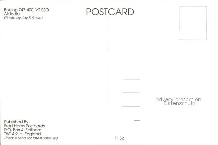Flugzeuge Zivil Air India Boeing 747-400 VT-ESO postalisch nicht gelaufen Erhaltung siehe scans