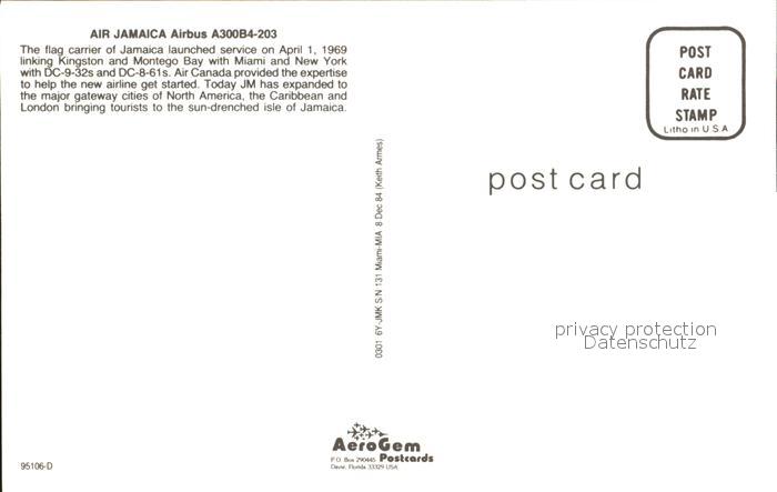 Flugzeuge Zivil Air Jamaica Airbus A300B4-203 postalisch nicht gelaufen Erhaltung siehe scans