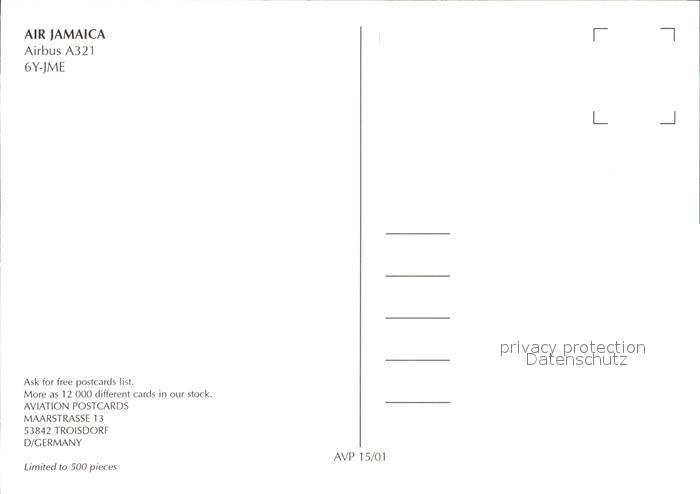 Flugzeuge Zivil Air Jamaica Airbus A321 6Y-JME postalisch nicht gelaufen Erhaltung siehe scans