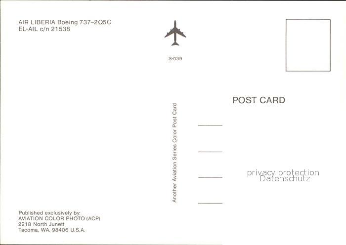 Flugzeuge Zivil Air Liberia Boeing 737-2Q5C EL-AIL c/n 21538 postalisch nicht gelaufen Erhaltung siehe scans