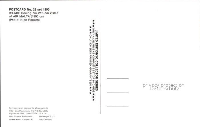Flugzeuge Zivil Air Malta Boleing 737-2Y5 9H-ABE c/n 23847 postalisch nicht gelaufen Erhaltung siehe scans