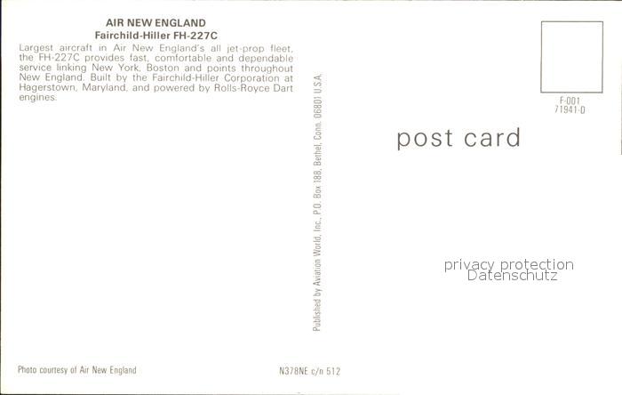 Flugzeuge Zivil Air New England Fairchild-Hiller FH-227C N378NE c/n 512 postalisch nicht gelaufen Erhaltung siehe scans