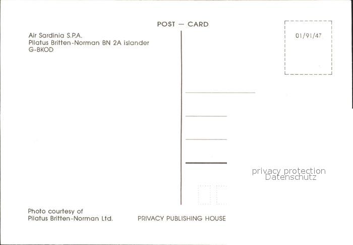 Flugzeuge Zivil Air Sardinia SPA Pilatus Britten-Norman BN 2A Islander G-BKOD postalisch nicht gelaufen Erhaltung siehe scans