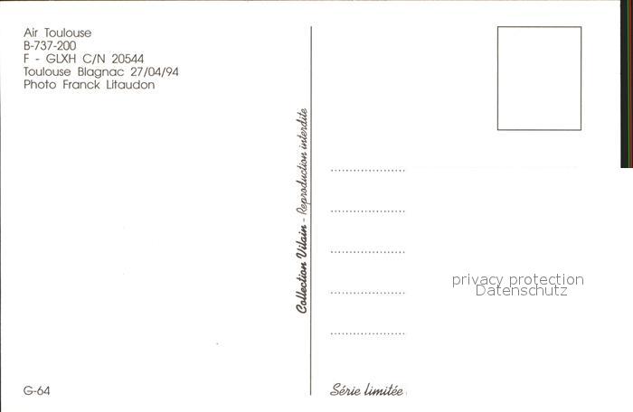 Flugzeuge Zivil Air Toulouse B-737-200 F-GLXH c/n 20544 postalisch nicht gelaufen Erhaltung siehe scans
