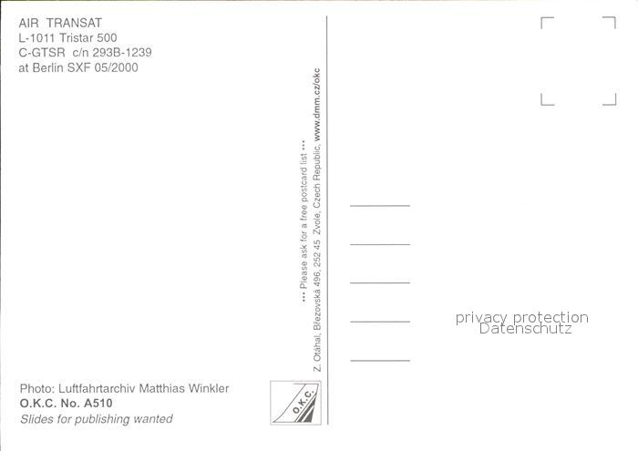 Flugzeuge Zivil Air Transat L-1011 Tristar 500 C-GTSR c/n 293B-1239 postalisch nicht gelaufen Erhaltung siehe scans