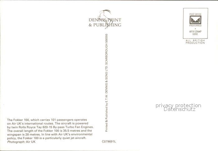Flugzeuge Zivil Air UK Fokker 100 postalisch nicht gelaufen Erhaltung siehe scans
