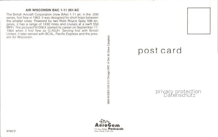 Flugzeuge Zivil Air Wisconsin BAC 1-11 201/AC postalisch nicht gelaufen Erhaltung siehe scans