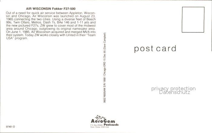 Flugzeuge Zivil Air Wisconsin Fokker F27-500 N505AW postalisch nicht gelaufen Erhaltung siehe scans