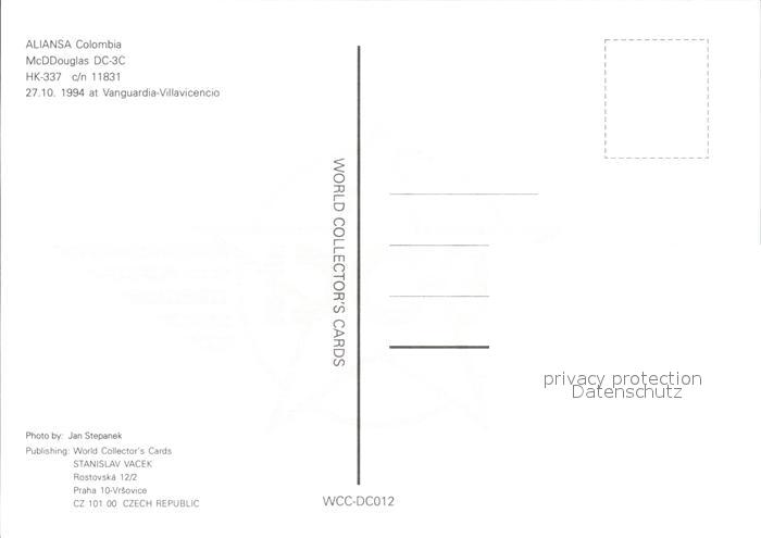 Flugzeuge zivil Aliansa Colombia McDDouglas DC-3C HK-337 c/n 11831 Vanguardia Villavicencio postalisch nicht gelaufen Erhaltung siehe scans
