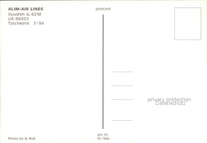Flugzeuge Zivil Alim-Air Lines Ilyshin IL-62M UK-86932 postalisch nicht gelaufen Erhaltung siehe scans