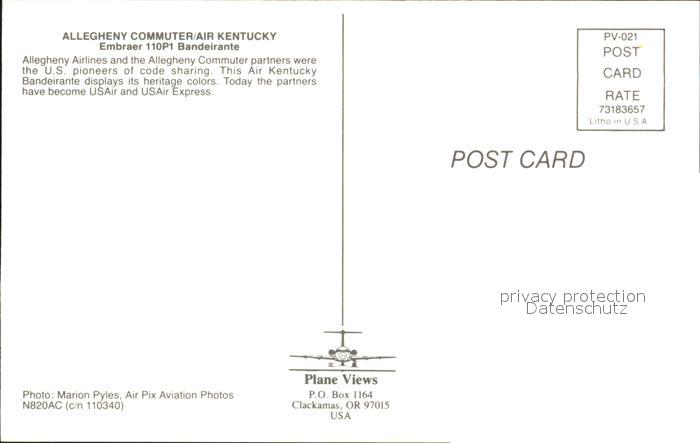 Flugzeuge Zivil Allegheny Commuter Air Kentucky Embraer 110P1 Bandeirante postalisch nicht gelaufen Erhaltung siehe scans