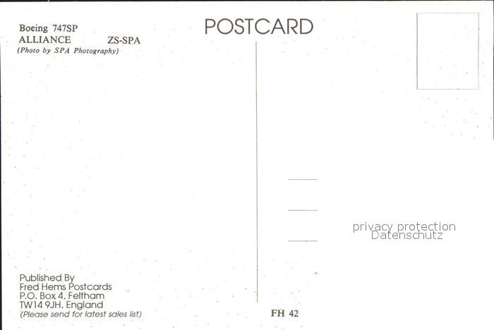 Flugzeuge Zivil Alliance Boeing 747SP ZS-SPA postalisch nicht gelaufen Erhaltung siehe scans