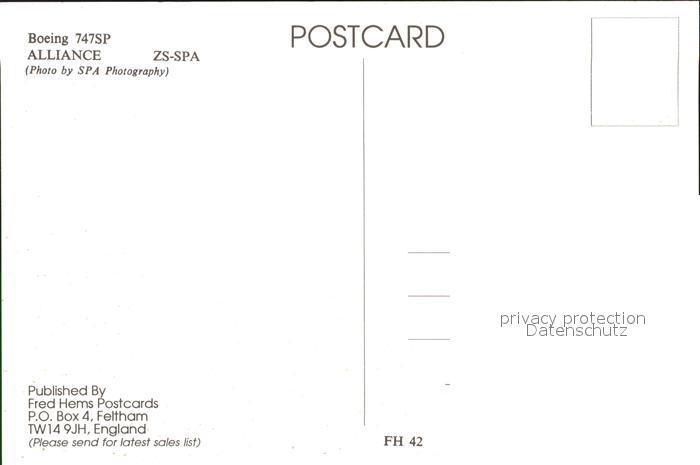 Flugzeuge Zivil Alliance Boeing 747SP ZS-SPA postalisch nicht gelaufen Erhaltung siehe scans