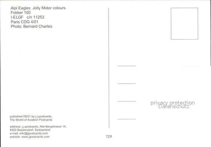 Flugzeuge Zivil Alpi Eagles Jolly Motor colours Fokker 100 I-ELGF c/n 11253 postalisch nicht gelaufen Erhaltung siehe scans
