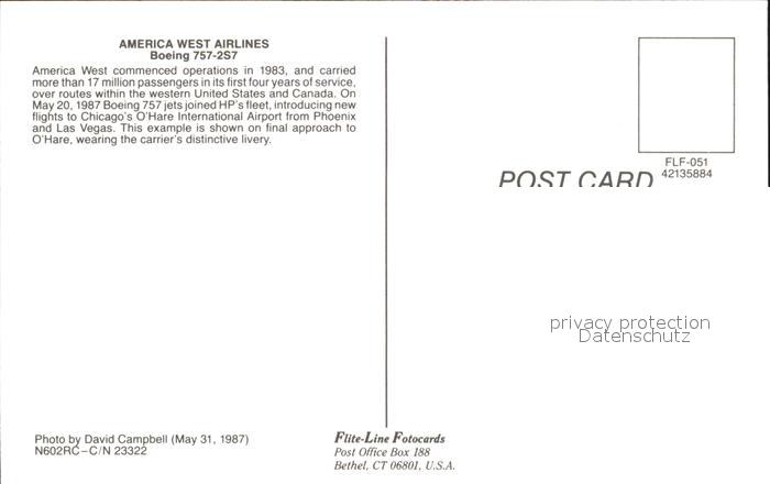 Flugzeuge Zivil America West Airlines Boeing 757-2S7 N602RC c/n 23322 postalisch nicht gelaufen Erhaltung siehe scans