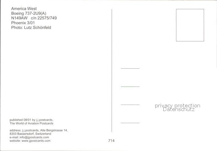 Flugzeuge Zivil America West Boeing 737-2U9 N149AW c/n 22575/749 postalisch nicht gelaufen Erhaltung siehe scans