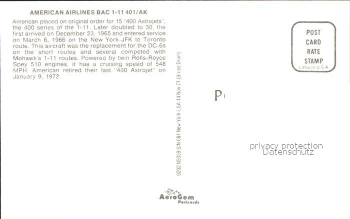 Flugzeuge Zivil American Airlines BAC 1-11 401 AK N5030 postalisch nicht gelaufen Erhaltung siehe scans