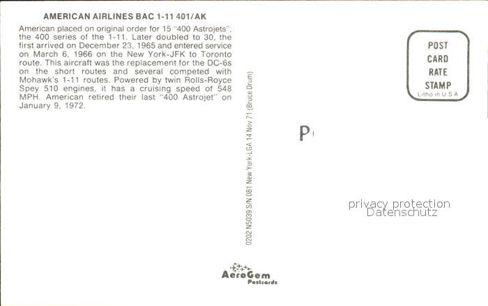 Flugzeuge Zivil American Airlines BAC 1-11 401/AK postalisch nicht gelaufen Erhaltung siehe scans