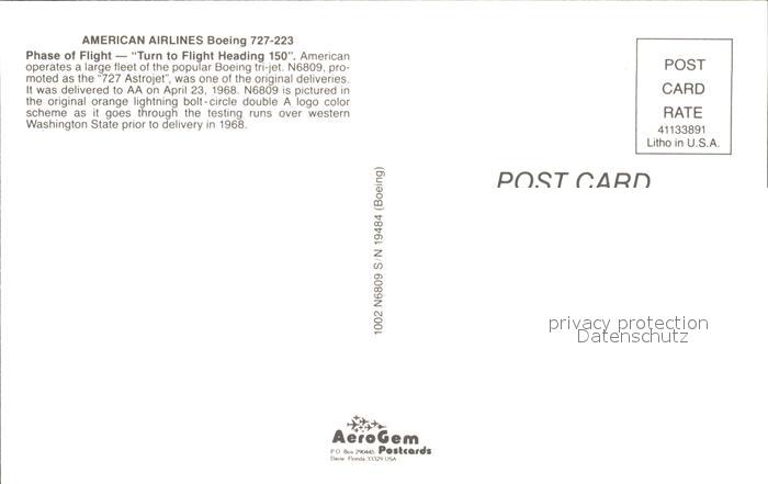 Flugzeuge Zivil American Airlines Boeing 727-223 N6809 S/N 19484 postalisch nicht gelaufen Erhaltung siehe scans