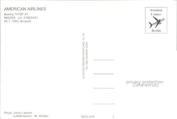Flugzeuge Zivil American Airlines Boeing 747SP-31 N602AA c/n 21963/441 postalisch nicht gelaufen Erhaltung siehe scans