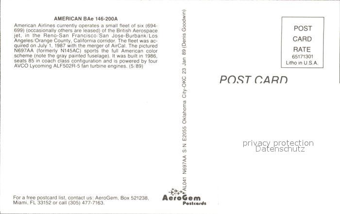 Flugzeuge Zivil American BAe 146-200A AL 041 N697AA S/N E2055 postalisch nicht gelaufen Erhaltung siehe scans