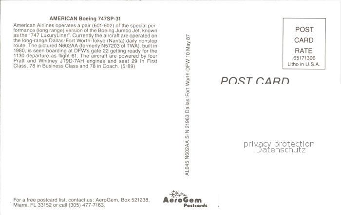 Flugzeuge Zivil American Boeing 747SP-31 N602AA S/N 21963 postalisch nicht gelaufen Erhaltung siehe scans