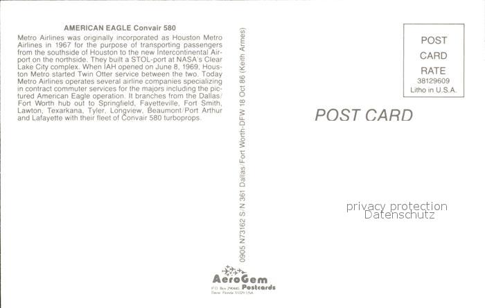 Flugzeuge Zivil American Eagle Convair 580 postalisch nicht gelaufen Erhaltung siehe scans
