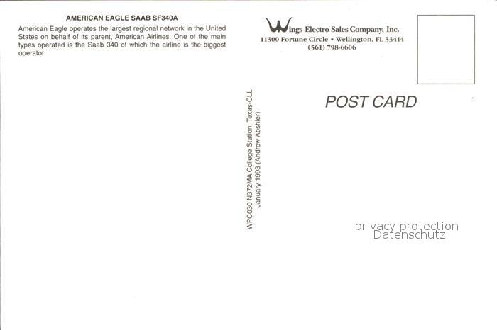 Flugzeuge Zivil American Eagle Saab SF340A N372MA postalisch nicht gelaufen Erhaltung siehe scans