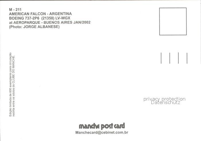 Flugzeuge Zivil American Falcon Boeing 737-2P6 21358 LV-WGX postalisch nicht gelaufen Erhaltung siehe scans