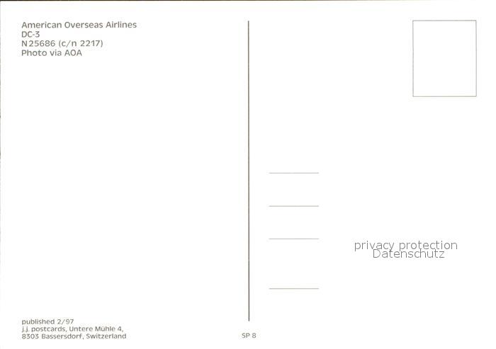 Flugzeuge Zivil American Overseas Airlines DC-3 N25686 c/n 2217 postalisch nicht gelaufen Erhaltung siehe scans