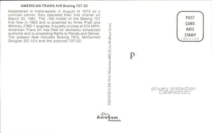 Flugzeuge Zivil American Trans Air Boeing 727-22 postalisch nicht gelaufen Erhaltung siehe scans