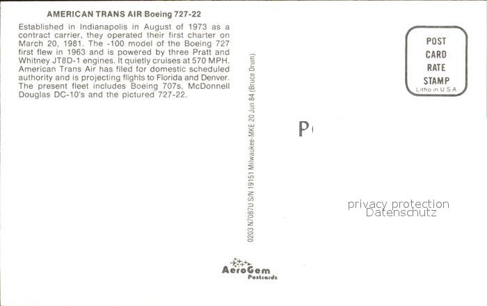 Flugzeuge Zivil American Trans Air Boeing 727-22 postalisch nicht gelaufen Erhaltung siehe scans