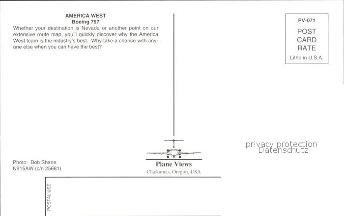 Flugzeuge Zivil American West Nevada Boeing 757 N915AW c/n 25681 postalisch nicht gelaufen Erhaltung siehe scans